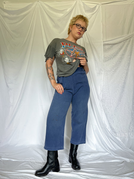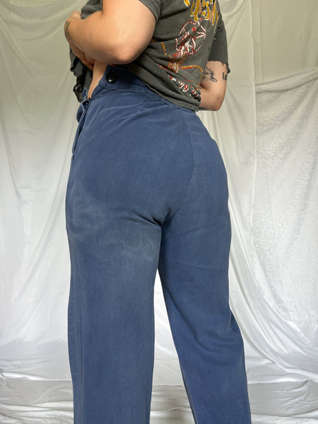 1930's cotton pants. Slight fading from previous wear. Side button closure. There are also a few minor spots as seen in the photos.