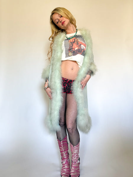 Incredible boudoir piece. 1930's baby blue robe with marabou trim. Metal hook and eye closure at the waist. Robe is a silky crepe chiffon.