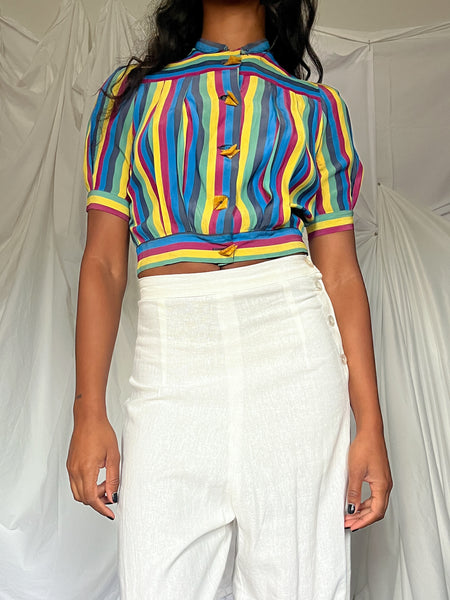 1930's rainbow striped satin blouse. An absolutely one of a kind piece. Front closure is made up of Bakelite triangle buttons. Blouse features a hook and eye closure at the very top.