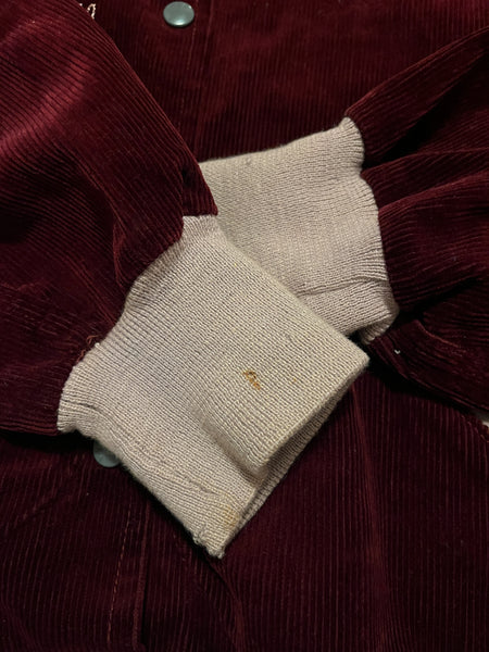 1940's basketball set/uniform. Dark burgundy corduroy bomber jacket, with matching basketball sport shorts. Embroidered on the jacket is "Chichester Varsity Basketball". Two slanted front pockets on the jacket. The shorts have a button fly front with a belt for adjustable sizing.