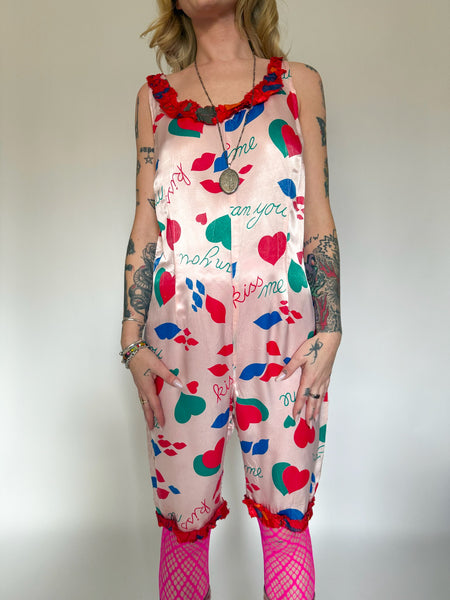 One of my favorite pieces I've ever owned. Satin 1940's handmade one piece romper. Made from a novelty fabric that reads 'kiss me' all over.