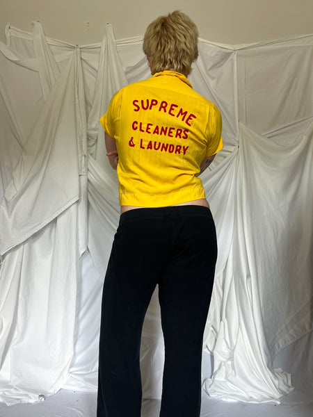 1950'S women's bowling shirt. Made from a yellow cotton. Chainstitched on the front is the name "Betty". The back reads "Supreme Cleaners & Laundry". Slight cropped style.