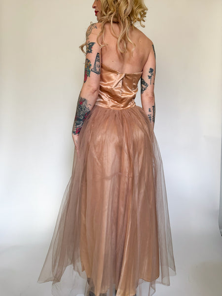 1950's dress made from a beautiful pinky-beige satin. Skirt has a tulle overlay. Tulle is weaved into the sweetheart neckline with a sequin trim. Side zip closure.