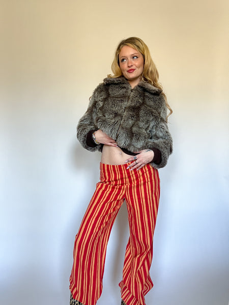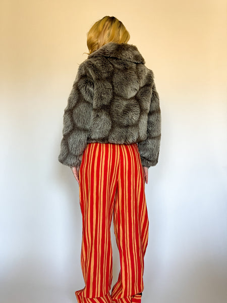 1960's faux fur bomber jacket. Has an exaggerated collar and cinches at the waist, giving it a true bomber style. Same cinching at the wrists. Metal zipper.