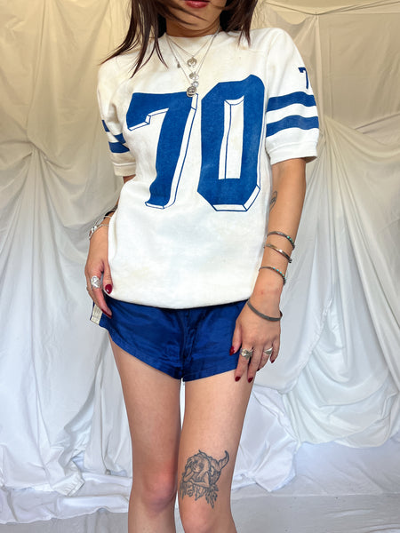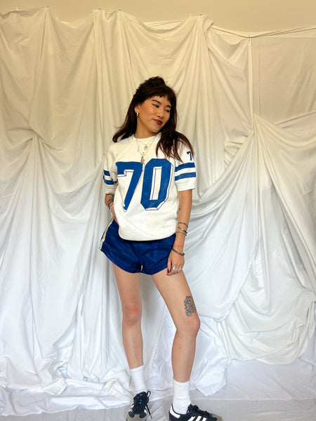 100% cotton short sleeve crewneck sweatshirt. White crewneck with blue vinyl printed numbering and details. Slight discoloration.