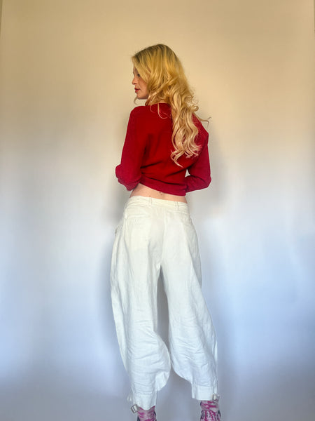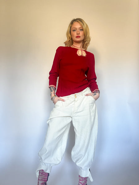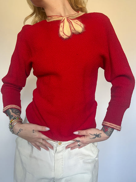 Red knit sweater with a dolman sleeve. Metal zip closure on back neck. Neckline is angora trimmed with a bow.