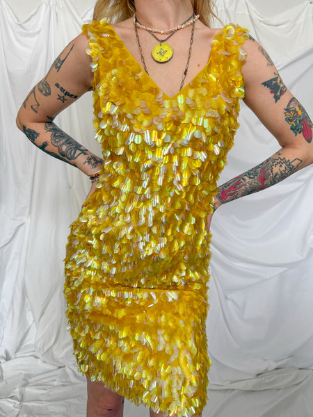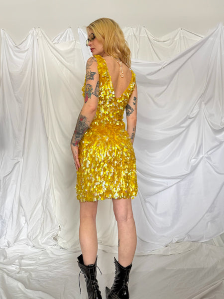 Incredible 1960's mini dress completely covered in yellow paillettes. Very few paillettes may be loose, but all are mainly in tact. Back zip closure.