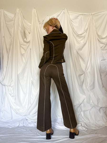 Iconic 70’s two piece set. So similar to Roncelli sets. Brown cotton denim fabric with light beige piping throughout. Jacket has an asymmetrical zip style.