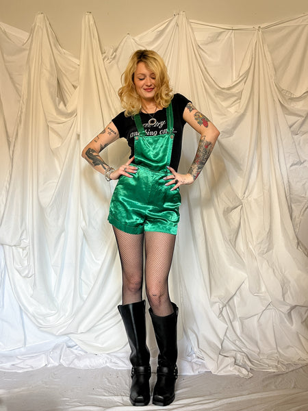 Green satin shortfalls. Homemade with slight imperfections throughout. Straps are attached via safety pins on the front.